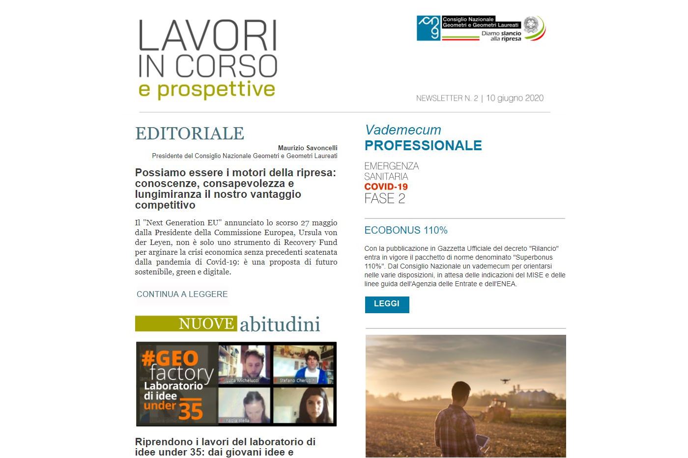 È nelle mail degli iscritti il secondo numero di LAVORI IN CORSO E PROSPETTIVE, la newsletter del Consiglio Nazionale dei Geometri e Geometri Laureati che vuole informare e aggiornare i Geometri sulle iniziative intraprese per la categoria, mettendo a disposizione riflessioni e strumenti di approfondimento. Qui disponibile l’anteprima online