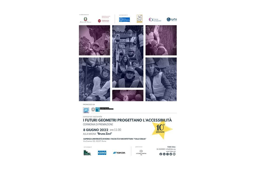 Si terrà mercoledì 8 giugno, alle ore 11, presso l’Aula Magna “Bruno Zevi” della Facoltà di Architettura di Valle Giulia (via Antonio Gramsci - 53) dell’Università di Roma La Sapienza, la cerimonia di premiazione della decima edizione del concorso nazionale “I futuri geometri progettano l’accessibilità”