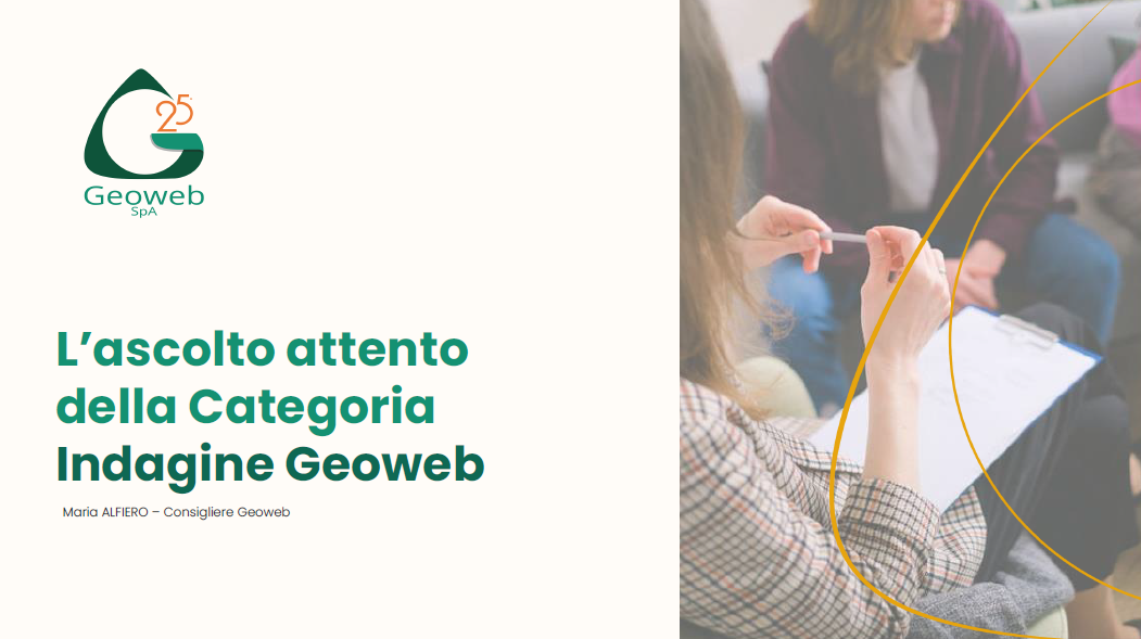 PROSPETTIVE E LINEE DI AZIONE. In chiusura, il consigliere Maria Alfiero ha sottolineato che i risultati dell’indagine costituiranno la base di un piano di sviluppo centrato su ascolto, trasparenza e innovazione. La sfida è posizionare Geoweb SpA come un soggetto capace di anticipare i bisogni della Categoria e accompagnare i geometri liberi professionisti nell’evoluzione digitale, normativa e culturale richiesta dall’attuale contesto.