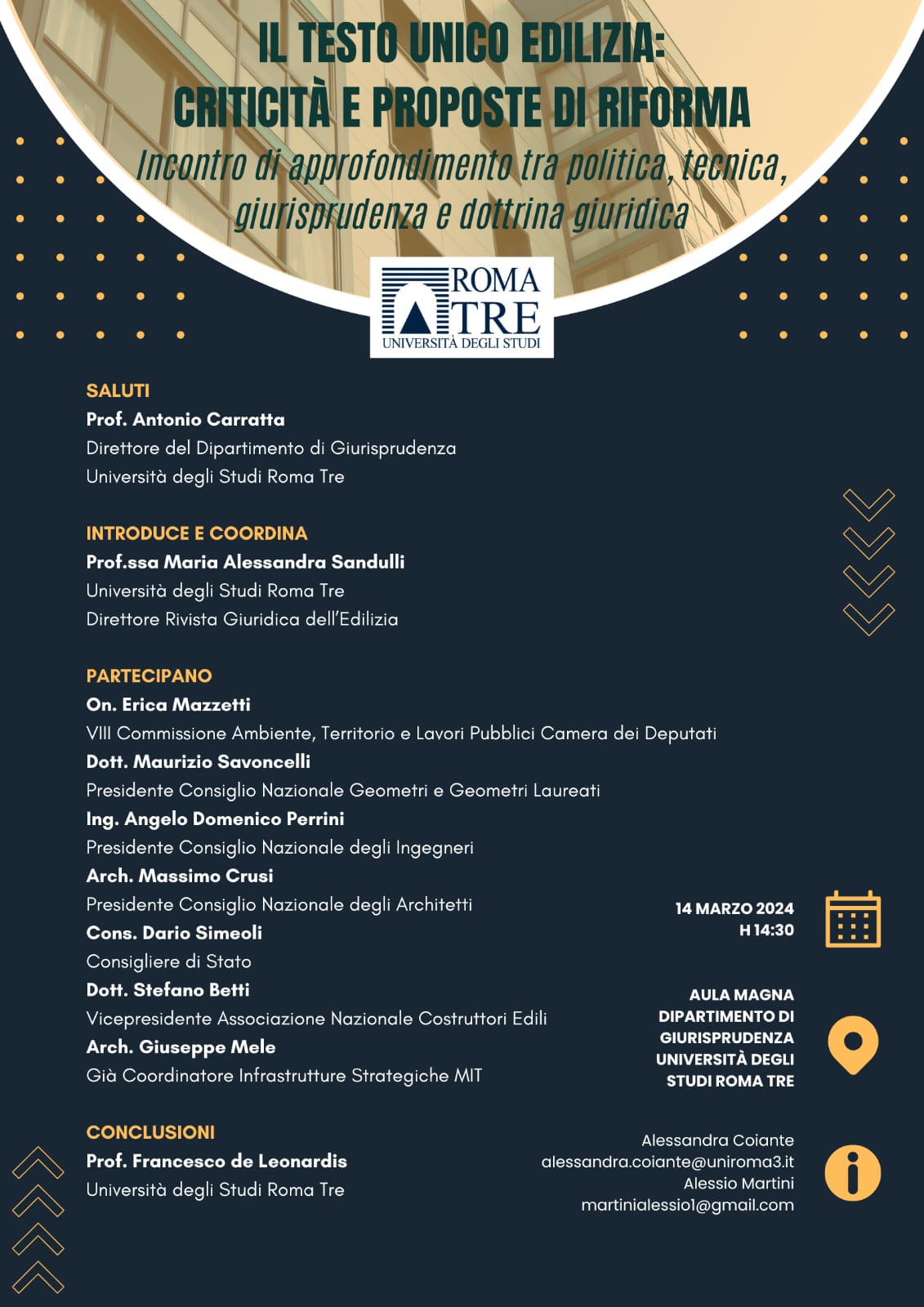 È fissato in calendario al 14 marzo 2024 il convegno “Il Testo Unico Edilizia: criticità e proposte di riforma. Incontro di approfondimento tra politica, tecnica, giurisprudenza e dottrina giuridica”, che si svolgerà dalle ore 14.30 in poi, presso l’Aula Magna del Dipartimento di Giurisprudenza dell’Università degli Studi di Roma Tre.