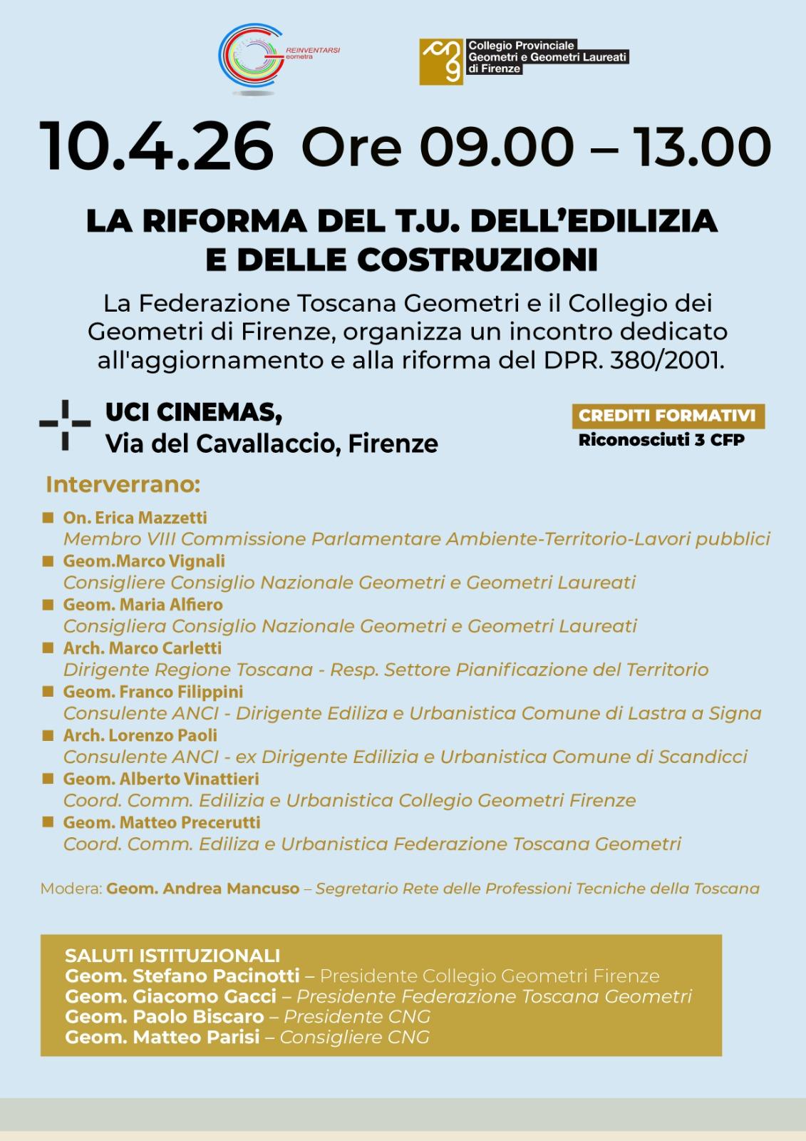 La Federazione Toscana Geometri, in collaborazione con il Collegio Provinciale Geometri e Geometri Laureati di Firenze, promuove l’incontro “La riforma del T.U. dell’edilizia e delle costruzioni”. Fissato in agenda per il 10 aprile 2026, l’approfondimento dedicato alla riforma del Testo Unico dell’edilizia e delle costruzioni e agli aggiornamenti sul DPR 380/2001