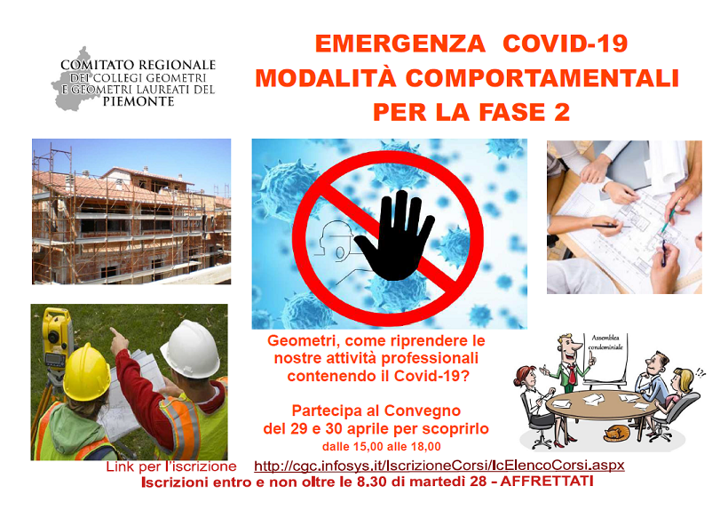 Con il corso di aggiornamento “Modalità comportamentali per la FASE2 – emergenza COVID-19” il Comitato Regionale dei Collegi dei Geometri e Geometri Laureati del Piemonte vuole segnare l’avvio della ripresa professionale delle attività. Si occuperanno dell’erogazione - in modalità esclusivamente frontale online – gli esperti di Categoria e i referenti delle autorità pubbliche regionali in base alle diverse tematiche