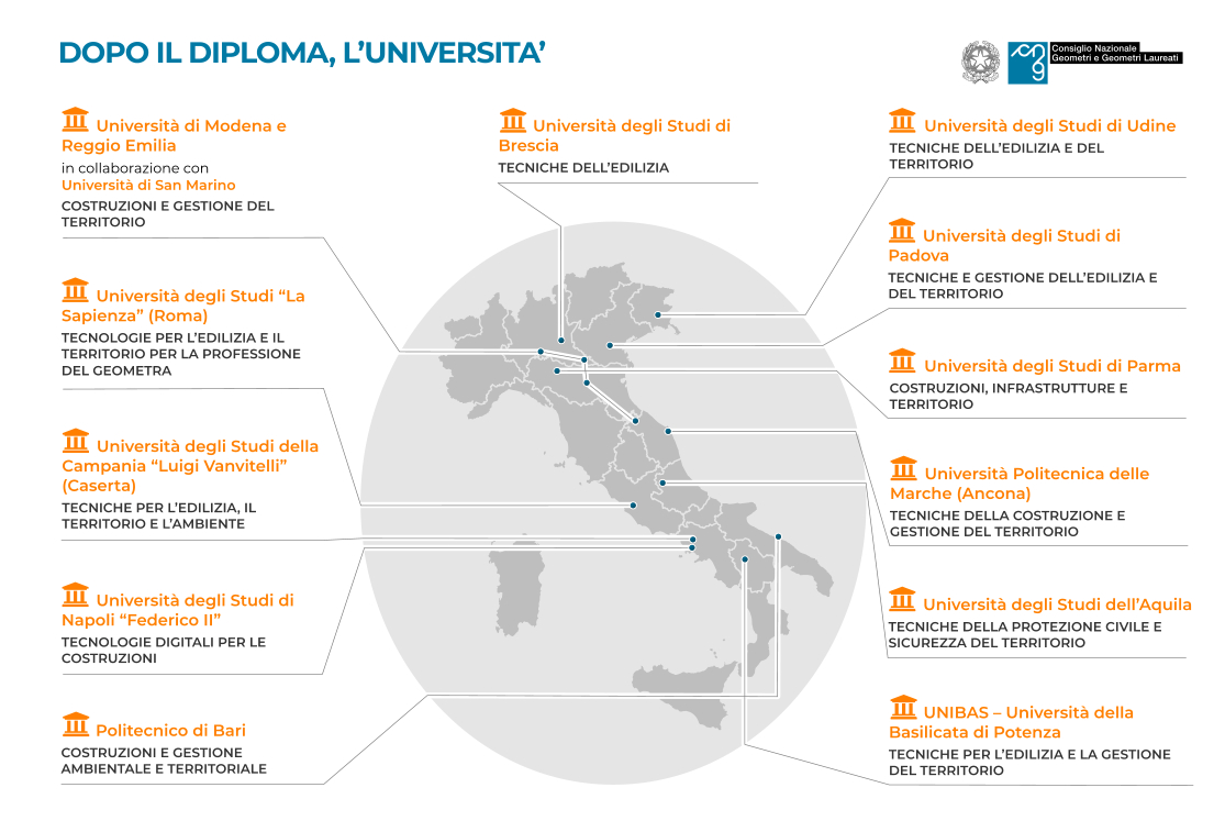 In partenza dal prossimo anno accademico (2021/2022), la classe di laurea professionalizzante in “Professioni Tecniche per l’edilizia e il territorio” (LP - 01) è il diploma triennale per il geometra laureato del domani. A seguito dell’istituzione ufficiale dello scorso anno (QUI il decreto ministeriale), nel nuovo titolo universitario confluiranno i corsi finora avviati per questa formazione specialistica (QUI la mappa aggiornata al 30/4/2021), una collaborazione fra gli atenei con i Collegi provinciali a cui si aggiungerà una marcia in più.