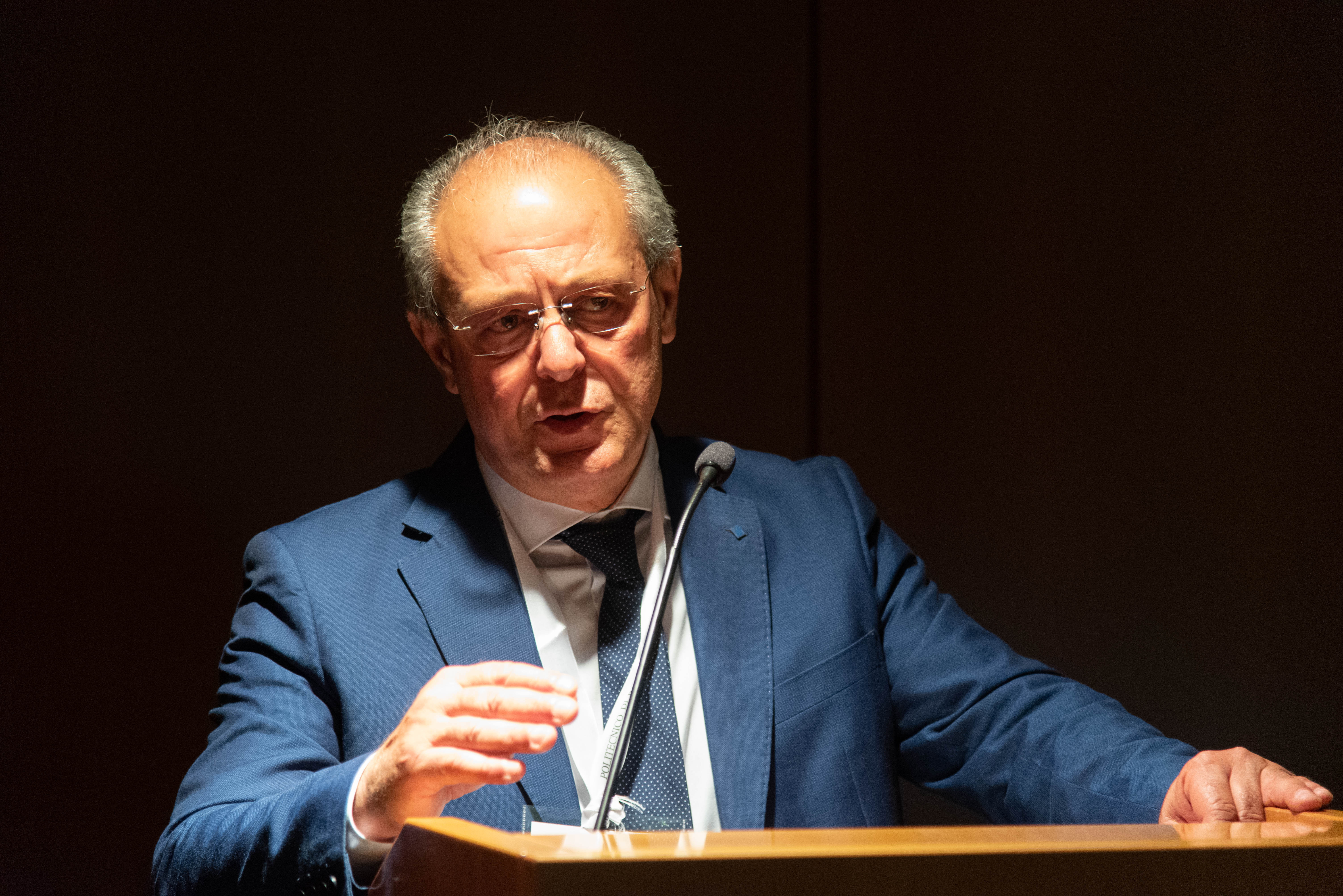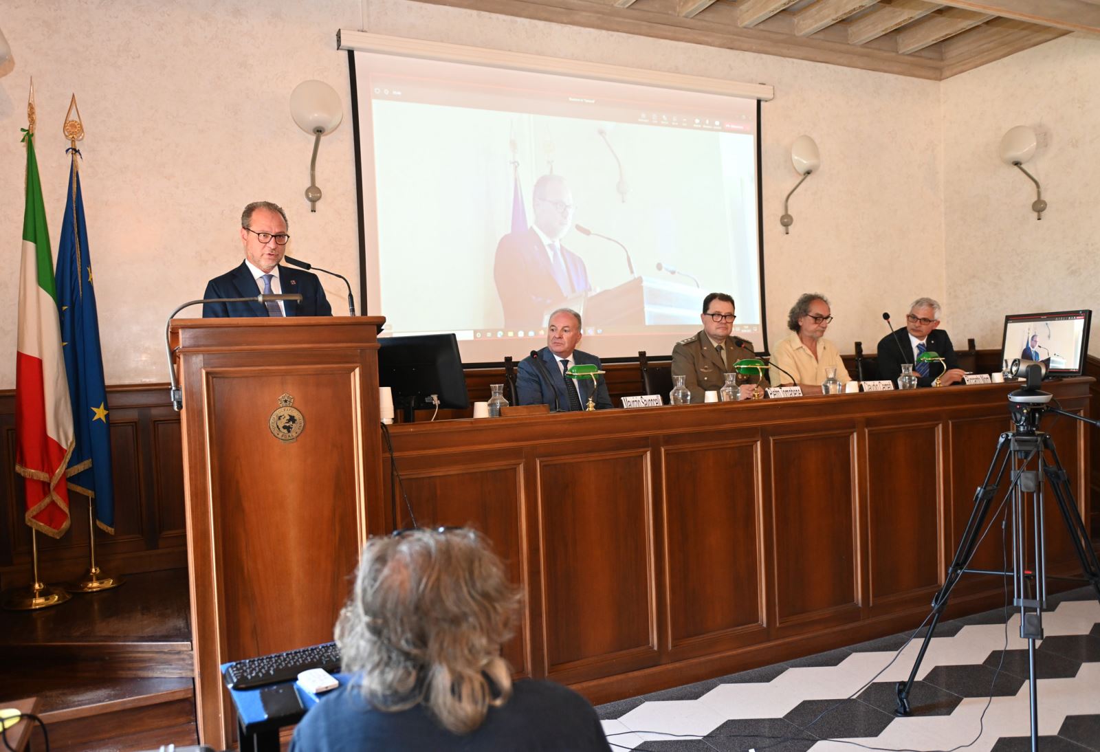Gli altri relatori al suo fianco: Pietro Tornabene, Comandante dell’Istituto Geografico Militare, Claudio Cerreti, Presidente della Società Geografica Italiana, Onorevole Giorgio Mulé, Sottosegretario di Stato alla Difesa.