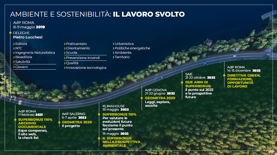 Ed ecco il progetto "Geometra 2030", presentato inizialmente nelle Assemblee dei Presidenti di Salerno e Genova e successivamente nei collegi di tutta Italia, nato con l’obiettivo di sviluppare una serie di operatività sui criteri ambientali da mettere in atto nella progettazione. Quindi, non solo prestazione energetica dell’edificio, ma visione di insieme dell’interazione e degli effetti sull’ambiente circostante. Infine, nel 2022 gli eventi sulle prospettive future del Superbonus e a marzo 2023 la presentazione della direttiva Green, per porre l’attenzione sugli obiettivi europei e internazionali.