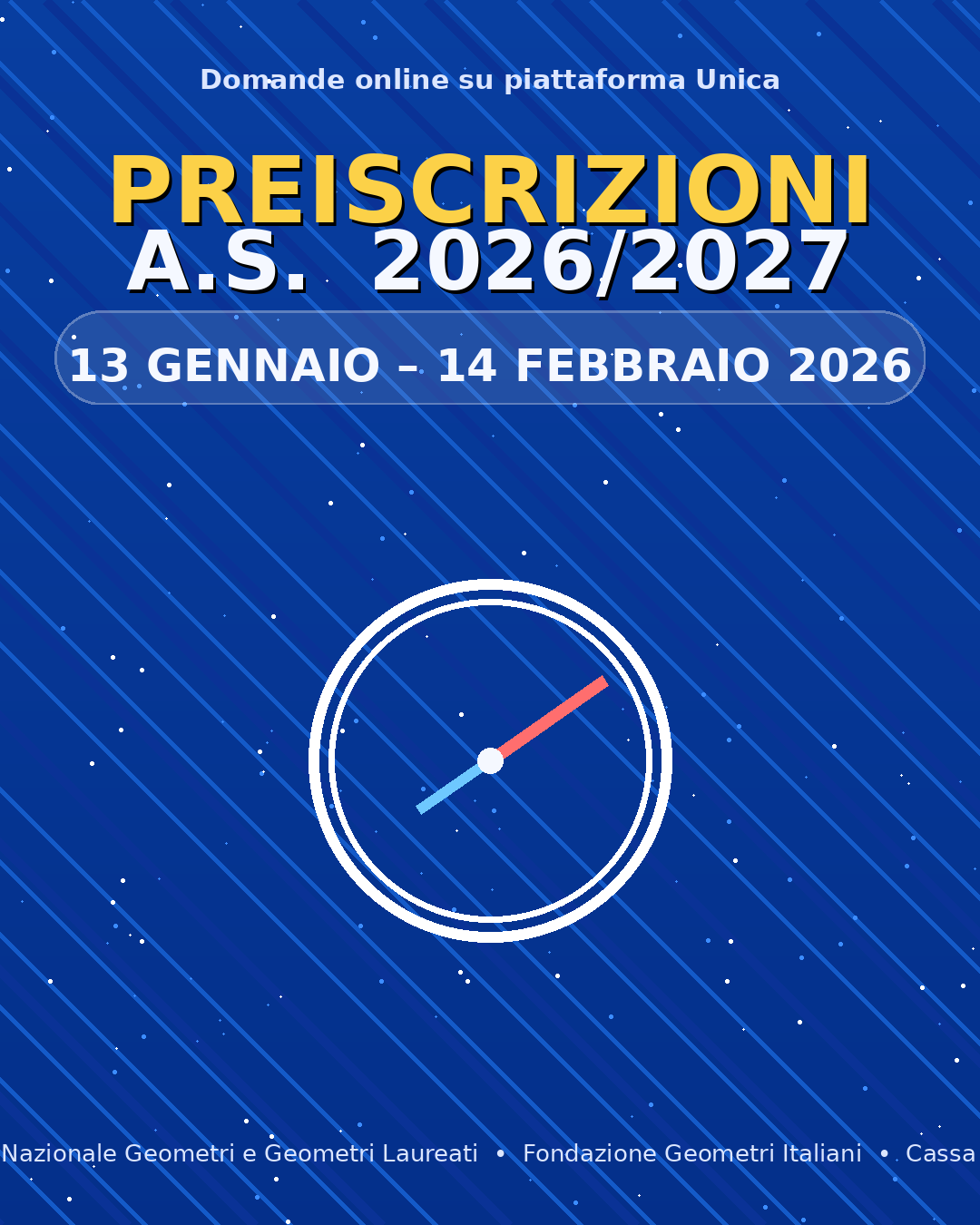 Dal 13 gennaio 2026 (ore 8:00) al 14 febbraio 2026 (ore 20:00) si aprono le iscrizioni alle prime classi per l’a.s. 2026/2027 tramite piattaforma Unica. Da oltre 13 anni Fondazione Geometri Italiani affianca famiglie, studenti e scuole con il progetto didattico “Georientiamoci. Una rotta per l’orientamento” e con un Test di orientamento gratuito, validato con l’Università degli Studi “Sapienza” di Roma
