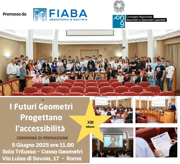 Giovedì 5 giugno, alle ore 11, la Sala Trilussa della Cassa Geometri di Roma (Via Luisa di Savoia, 17) ospiterà la cerimonia di premiazione della XIII edizione di "I futuri geometri progettano l'accessibilità", il concorso nazionale che vede protagonisti gli studenti degli istituti tecnici CAT nella sfida per città più inclusive