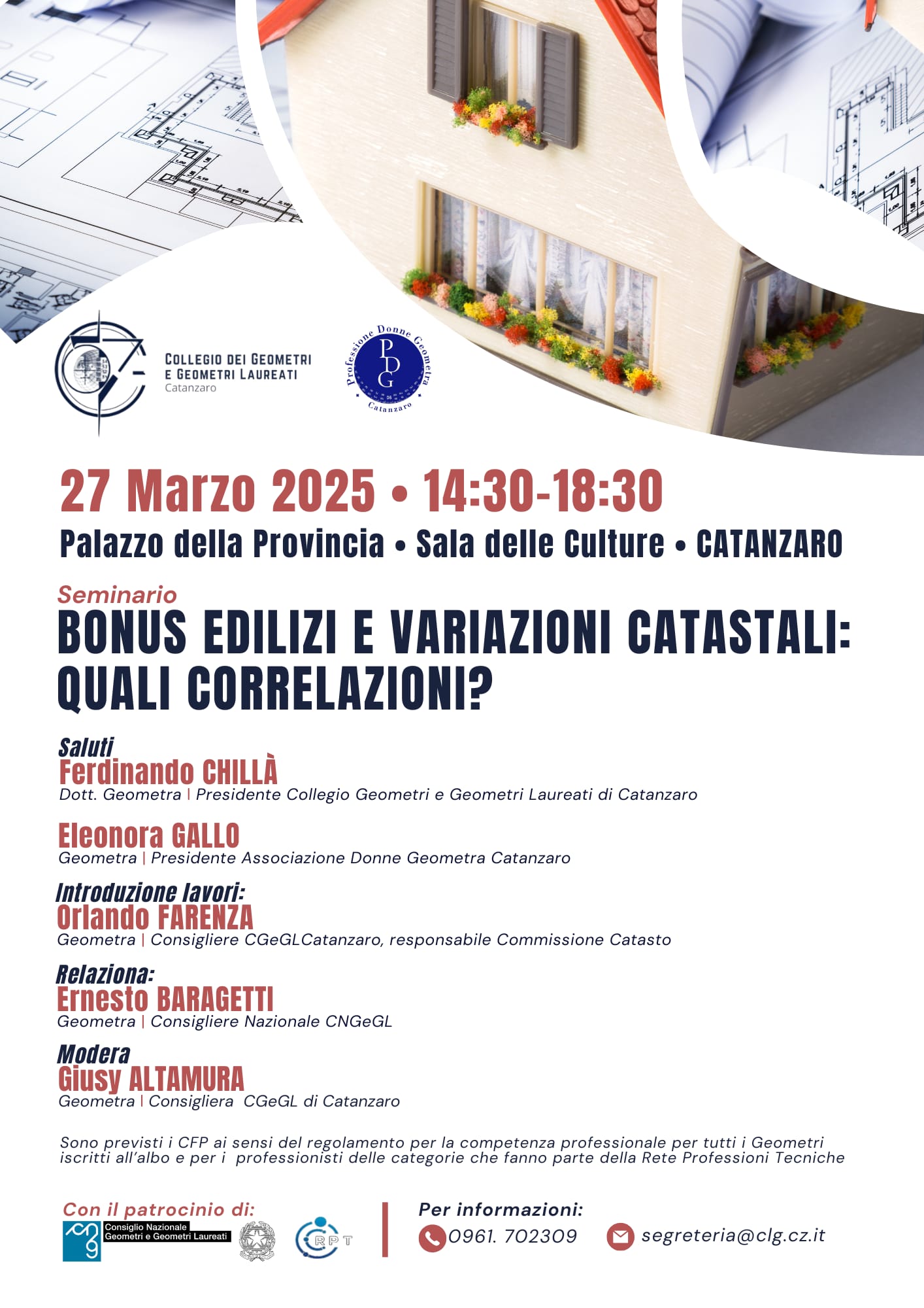 "Bonus edilizi e variazioni catastali - correlazioni e implicazioni" è il tema del seminario organizzato dal Collegio Provinciale Geometri e Geometri Laureati di Catanzaro, in programma il 27 marzo 2025, presso la Sala delle Culture del Palazzo della Provincia, a Catanzaro. Per il Consiglio Nazionale Geometri e Geometri Laureati interverrà il consigliere nazionale CNGeGL Ernesto Alessandro Baragetti, delegato al catasto
